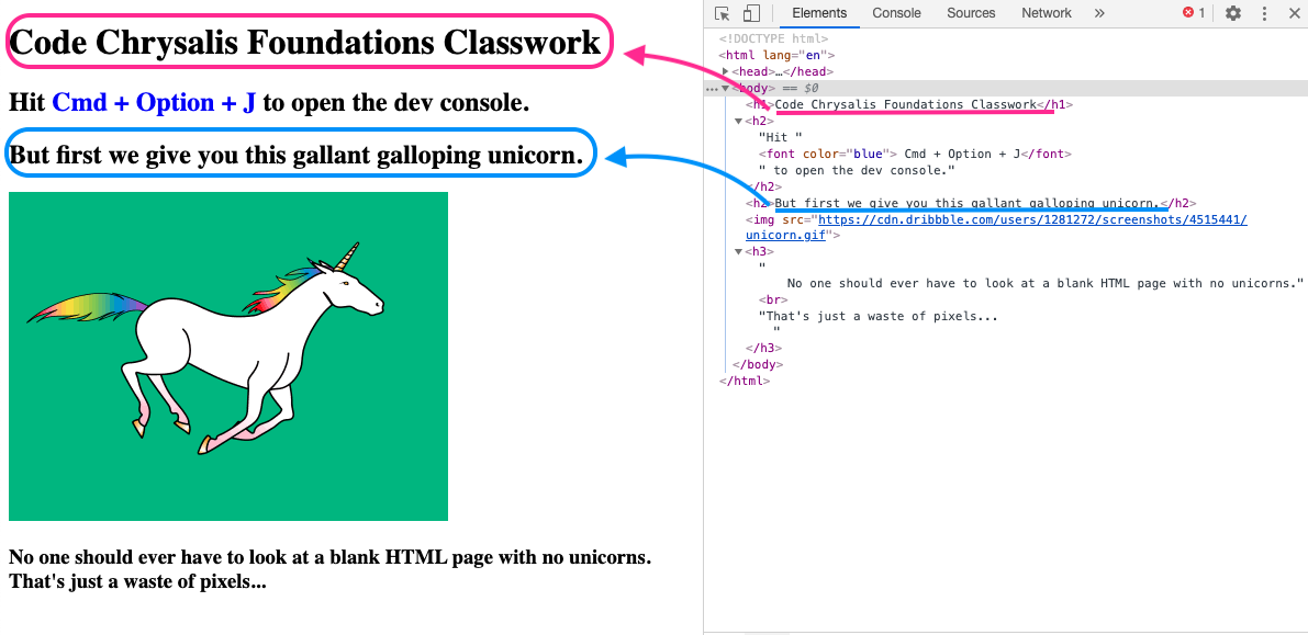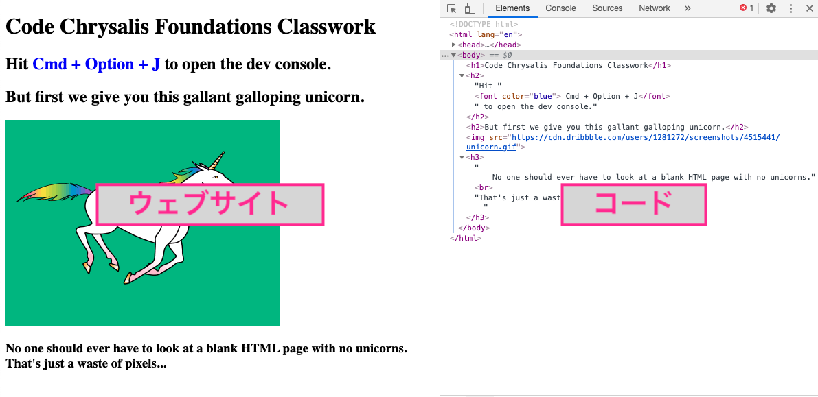 先ほどの図では、HTMLで書かれた文字が、ウェブサイトに表示されることがわかりました。では、ユニコーンの画像はどこからきたのでしょう?そして文字の大きさや色が変わるのはなぜでしょう? では、実際にコードを書いてみてその答えを探してみましょう!