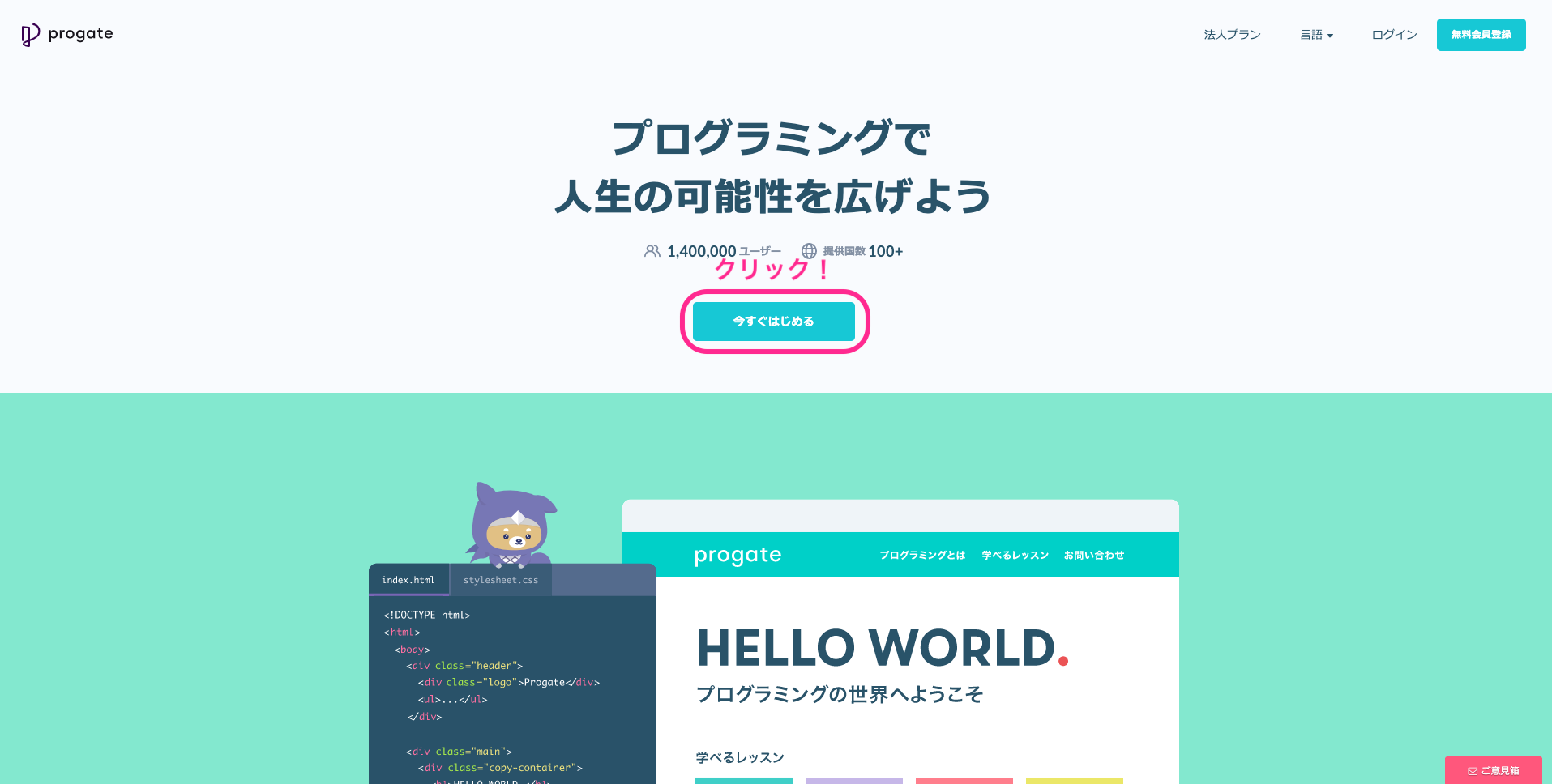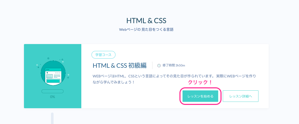 ここをクリックしてProgateのHTML&CSSのコースを開く