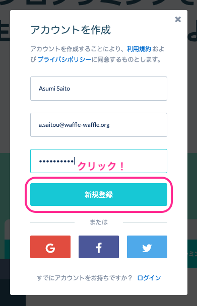 2.「アカウントを作成」という画面が出てきたら、名前(ニックネームも可能です)とメールアドレス、パスワードを設定して「新規登録」をクリックします。これで登録は完了です。
