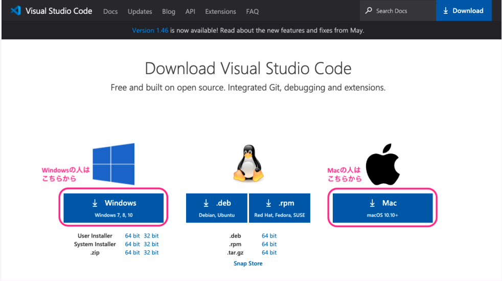 Windows の人は Windows というボタンを、Mac の人は Mac のボタンをクリックしてください。クリックするとダウンロードが始まります。