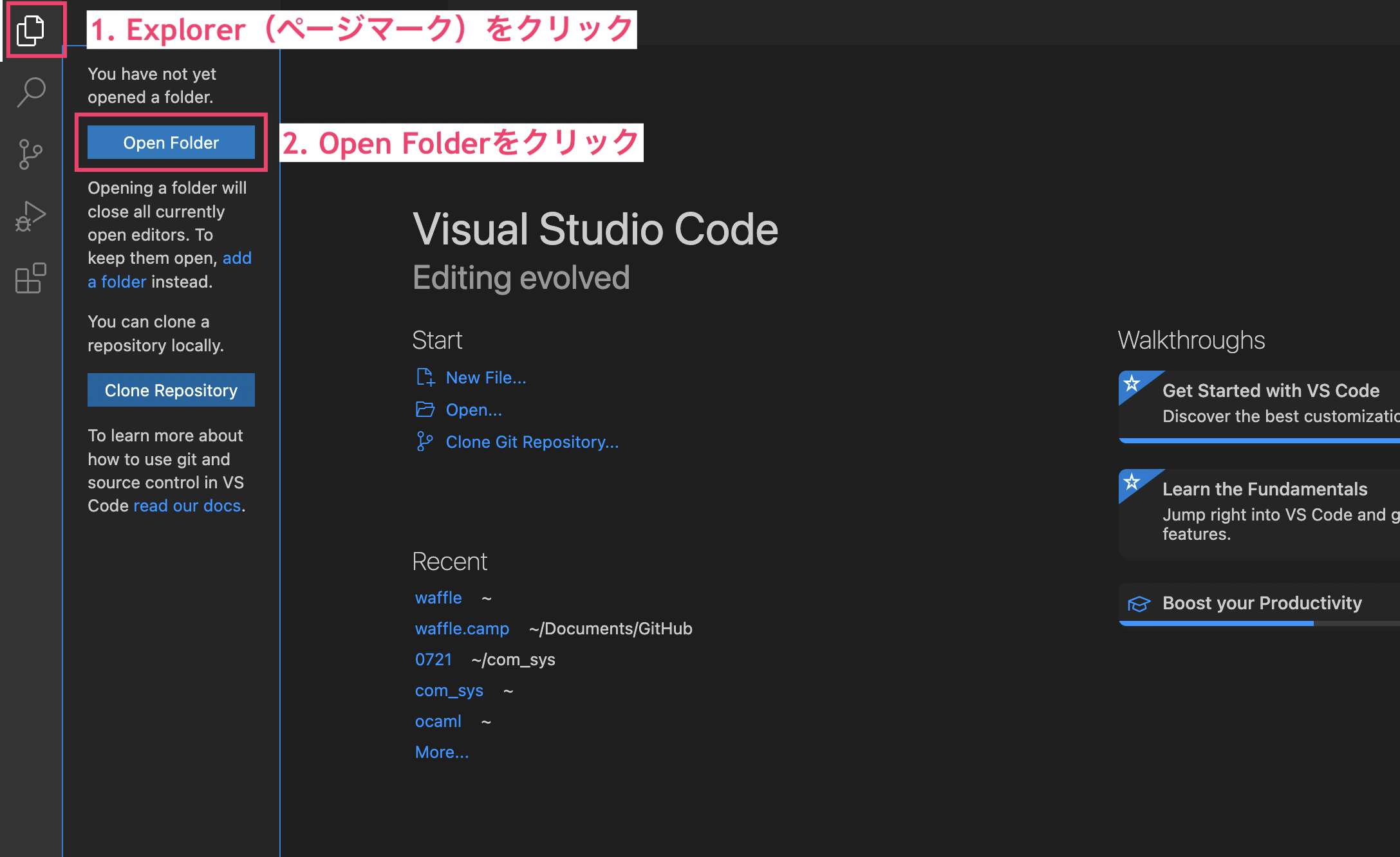 Explorer をクリックした後に、Open Folder を押す