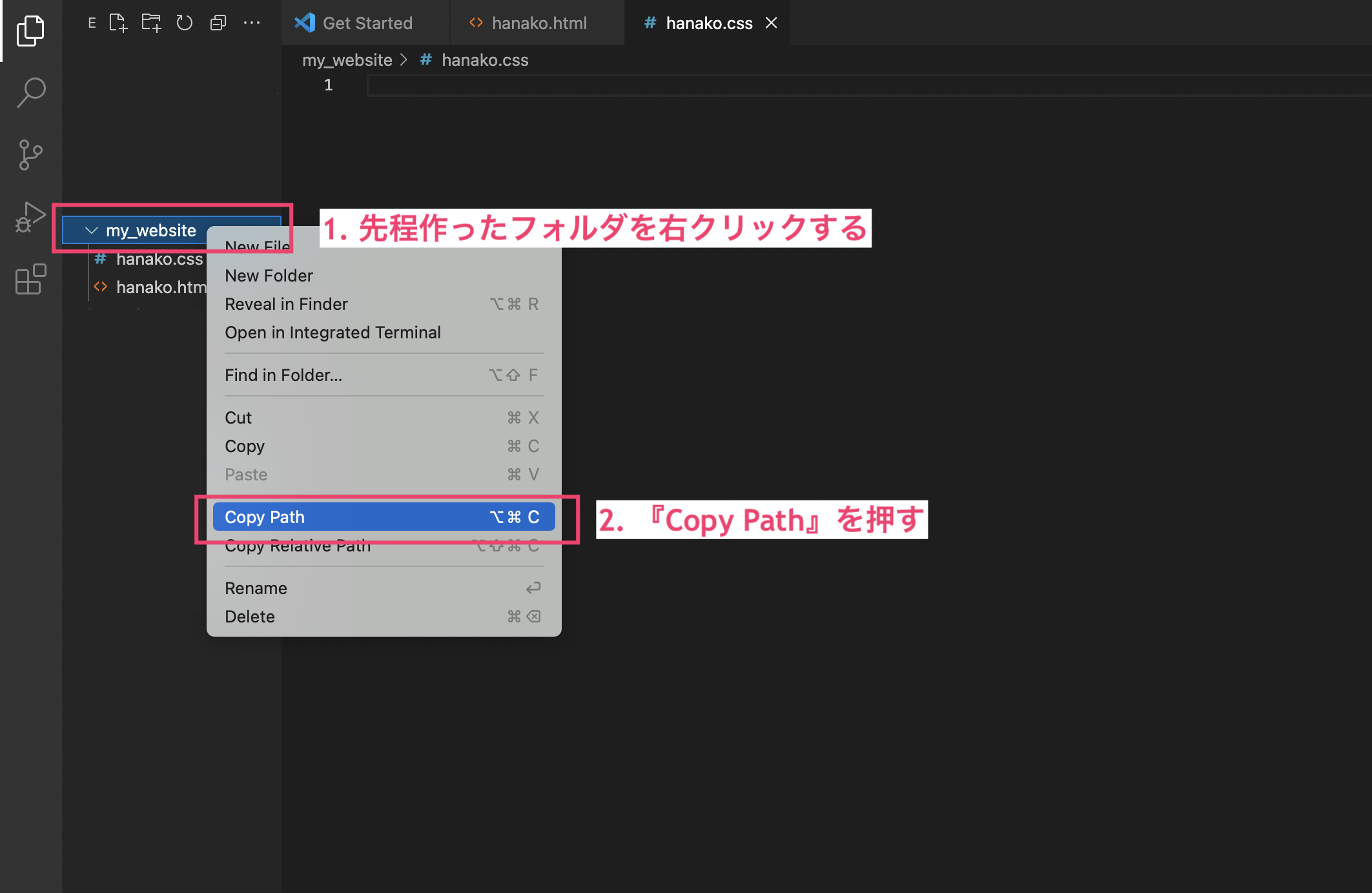 作成したフォルダを右クリックして、Copy Path を押す