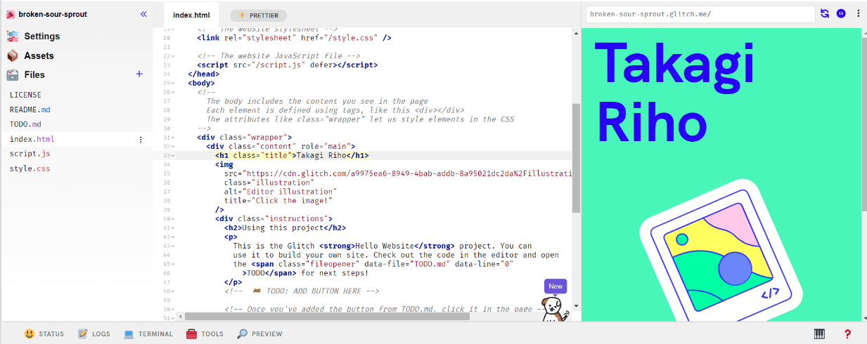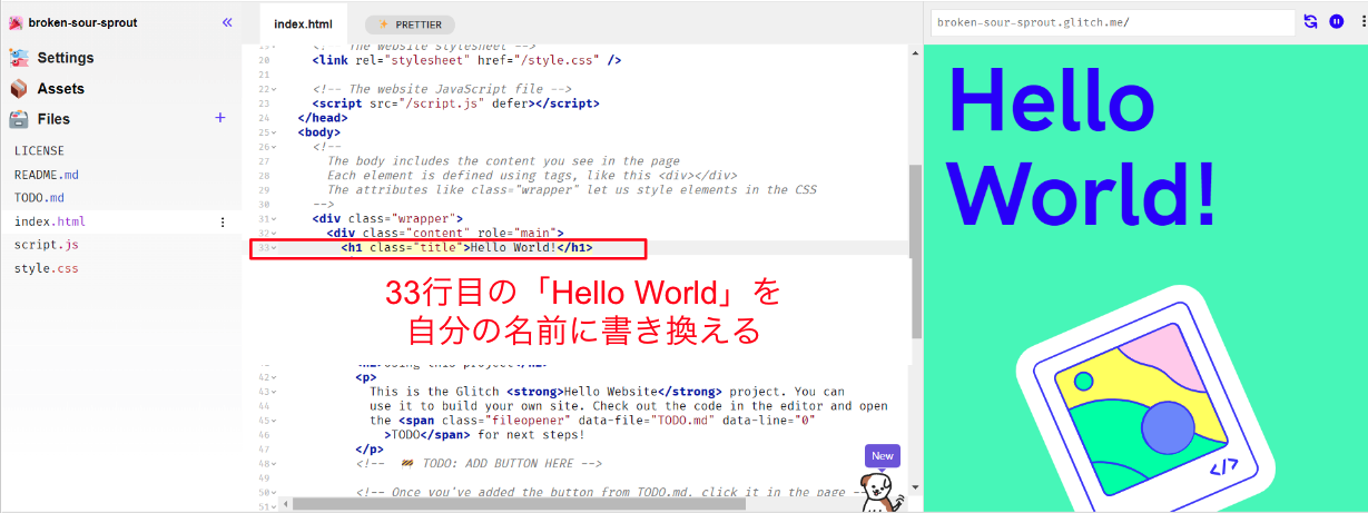 33 行目の「Hello World」を自分の名前に変えてみましょう