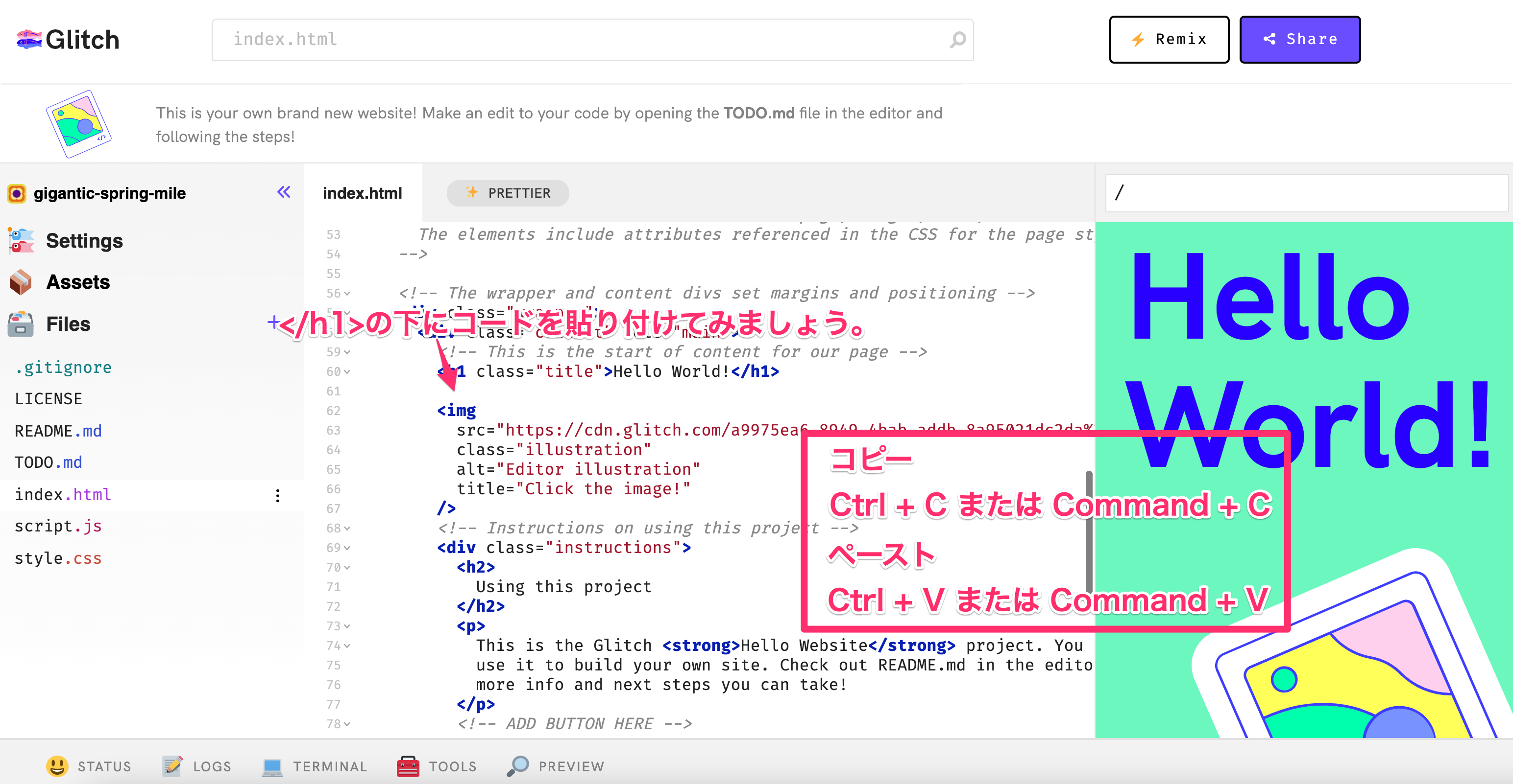 3. 『Hello World!』の部分が自分の名前になっていることを確認してみましょう#