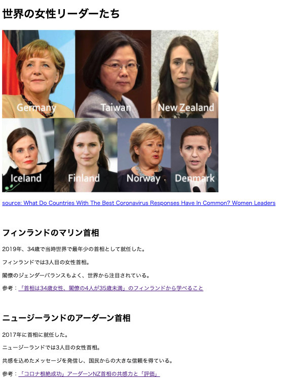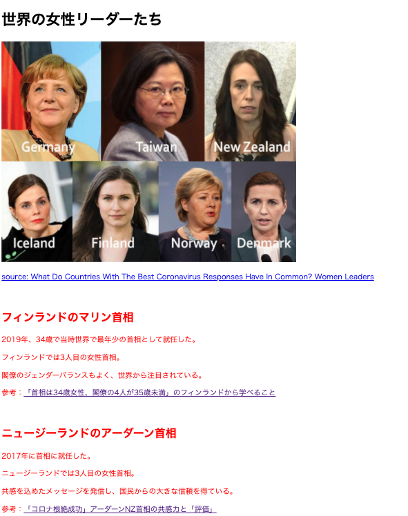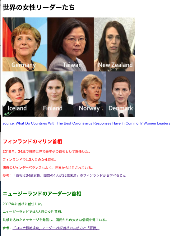<body> <h1>世界の女性リーダーたち</h1> <a href="https://www.forbes.com/sites/avivahwittenbergcox/2020/04/13/what-do-countries-with-the-best-coronavirus-reponses-have-in-common-women-leaders/?sh=3c1d6b2a3dec" ><p> source: What Do Countries With The Best Coronavirus Responses Have In Common? Women Leaders </p></a > <div class="marin"> <h2>フィンランドのマリン首相</h2> <p>2019年、34歳で当時世界で最年少の首相として就任した。</p> <p>フィンランドでは3人目の女性首相。</p> <p>閣僚のジェンダーバランスもよく、世界から注目されている。</p> <p> 参考:<a href="https://courrier.jp/news/archives/194898/" >「首相は34歳女性、閣僚の4人が35歳未満」のフィンランドから学べること</a > </p> </div> <img src="https://docs.waffle-waffle.org/img/logo.png" alt="waffle logo" border="0" /> </body></html>ここから、「マリン首相に関する文章は赤色の文字、アーダーン首相に関する文章は緑色の文字」に変更しましょう!!
