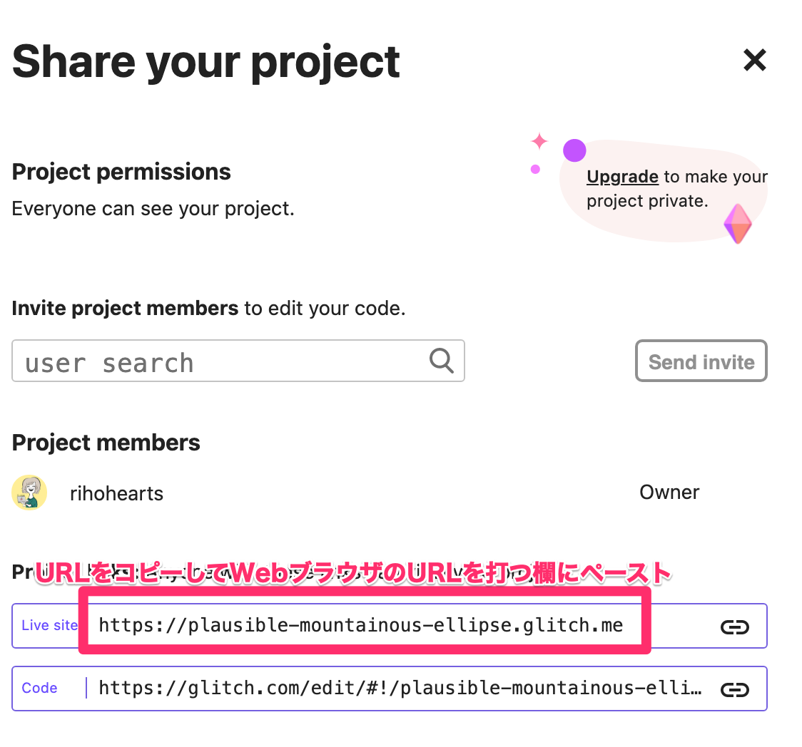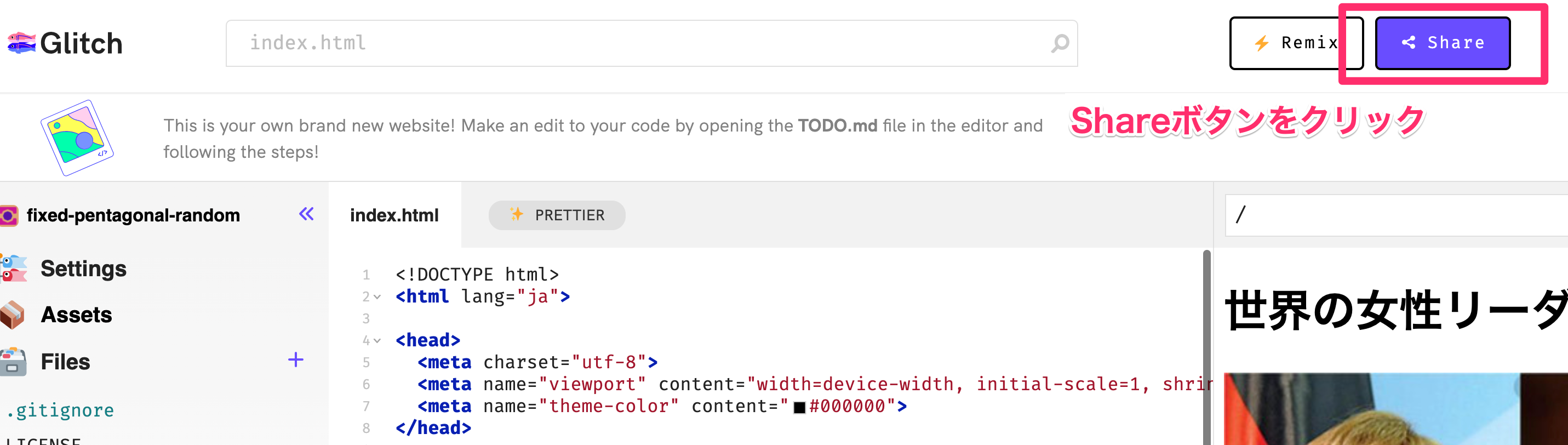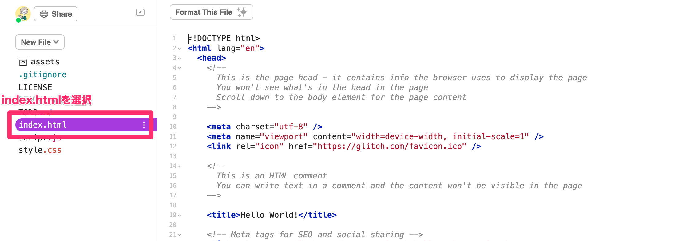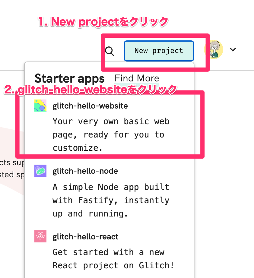 Glitch で『New project』をクリックし『glitch-hello-website』をクリック
