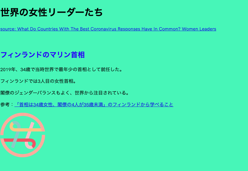 <body> <h1>世界の女性リーダーたち</h1> <a href="https://www.forbes.com/sites/avivahwittenbergcox/2020/04/13/what-do-countries-with-the-best-coronavirus-reponses-have-in-common-women-leaders/?sh=3c1d6b2a3dec" ><p> source: What Do Countries With The Best Coronavirus Responses Have In Common? Women Leaders </p></a > <div class="marin"> <h2>フィンランドのマリン首相</h2> <p>2019年、34歳で当時世界で最年少の首相として就任した。</p> <p>フィンランドでは3人目の女性首相。</p> <p>閣僚のジェンダーバランスもよく、世界から注目されている。</p> <p> 参考:<a href="https://courrier.jp/news/archives/194898/" >「首相は34歳女性、閣僚の4人が35歳未満」のフィンランドから学べること</a > </p> </div> <img src="https://docs.waffle-waffle.org/img/logo.png" alt="waffle logo" border="0" /> </body></html>保存する。(Windows の場合は『Ctrl ボタン+s』, Mac の場合は『Command ボタン+s』)
